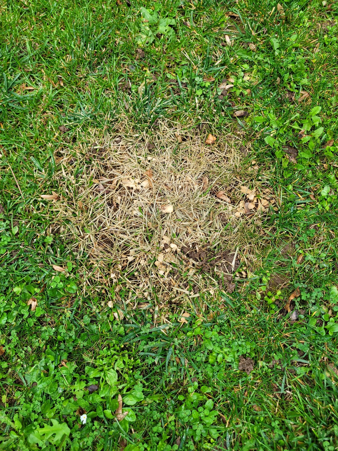 ich habe heute eine runde, etwa Teller-große Stelle in unserem Rasen (Wiese) entdeckt auf der das Gras bzw. der Bewuchs abgestorben ist. Mann könnte meinen das Gras wäre am dieser Stelle verdorrt wenn der restliche Rasen der aktuellen Witterung entsprechend nicht komplett grün und feucht wäre. Ich kann auch ausschließen dass an dieser Stelle etwas gestanden hat, also bspw. ein Eimer oder so. Ich meine im Zentrum der Stelle auch so etwas wie die Überreste eines "Stammes" oder so ausmachen zu können (letztes Bild).