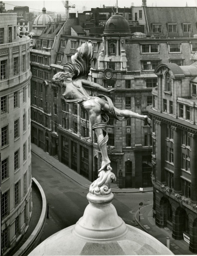 Charles Wheeler’s sculpture of Ariel on top of the dome in c. 1930. Photo courtesy Bank of England Museum, London