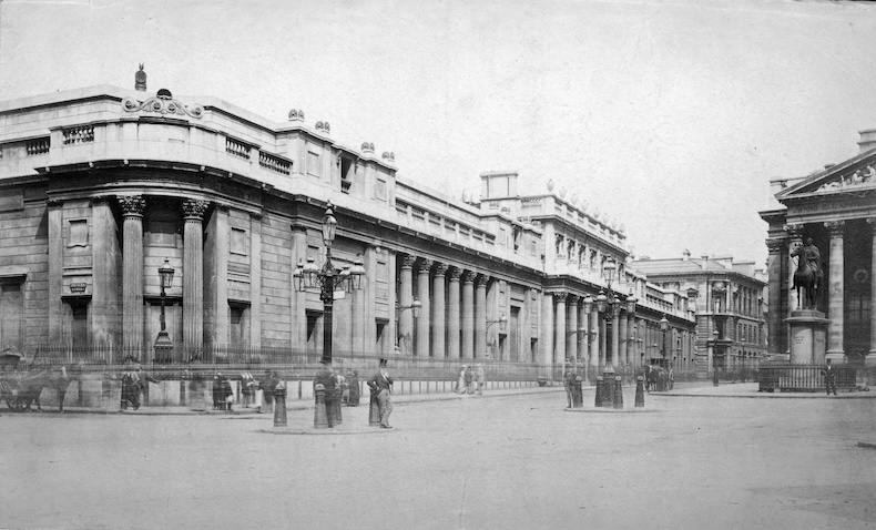 The old Bank of England building designed by Sir John Soane on Threadneedle Street, London, photographed in c. 1870. Photo by Hulton Archive/Getty Images