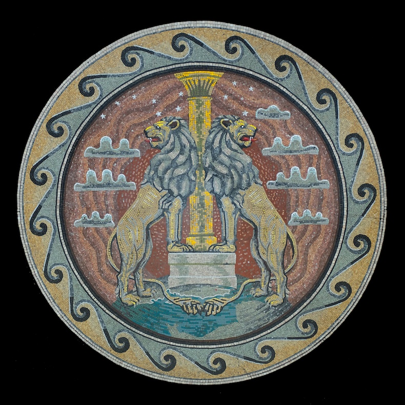 Floor mosaic designed by Boris Anrep in the Bank of England’s entrance hall, depicting lions guarding a pilla (1930s). Photo: courtesy Bank of England Museum, London