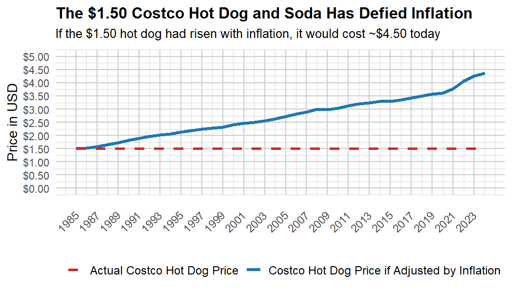 Did you know that the price of a Costco hot dog with a soda has stayed the same at just $1.50 since 1985 even through inflation?