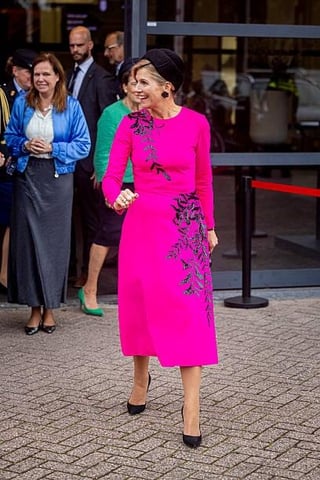 She is stunning in this dress! It’s the same one she wore as part of the UK state visit: https://www.dailymail.co.uk/femail/article-6311227/amp/Queen-Maxima-Netherlands-puts-animated-display-Countess-Wessex.html