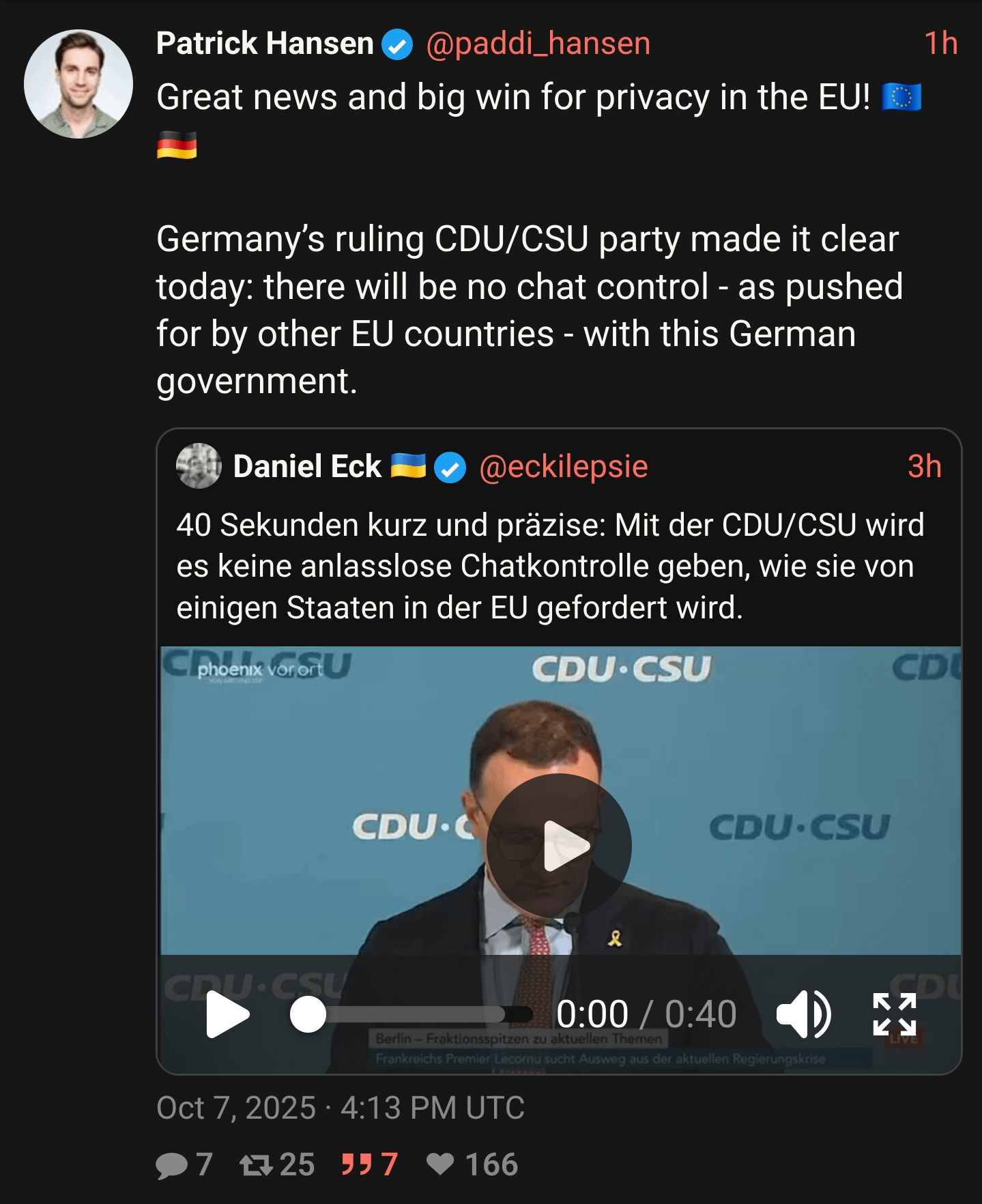 Look at the wording of it. *”There will be no chat control as pushed for by other EU countries.”*