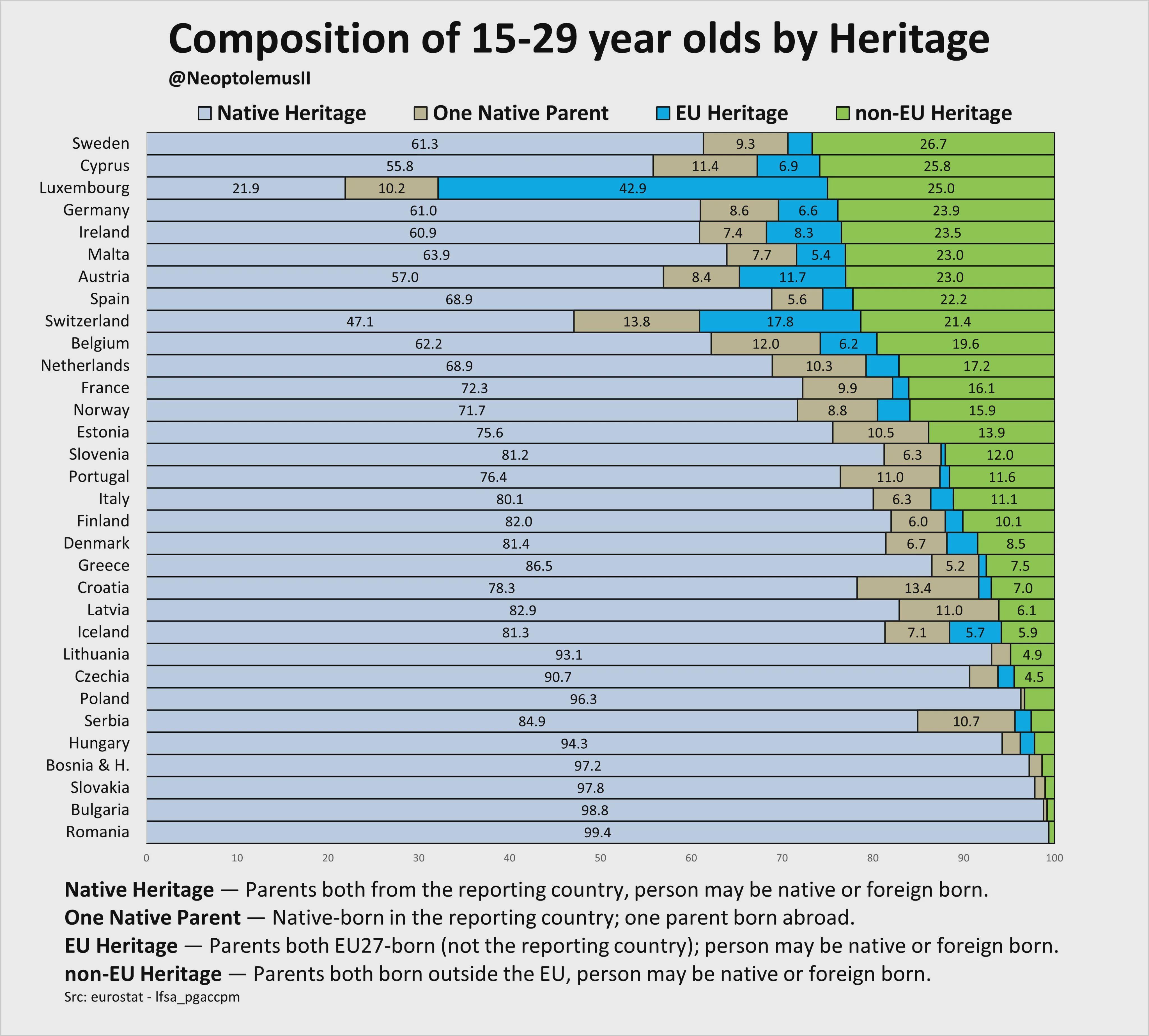 Rätt coolt ändå att ca 10% har en infödd och en invandrad förälder i många av länderna här. Jag är själv en produkt av en sån relation, och får jag egna barn så kommer även de ha en invandrad förälder då min make kommer från Sydamerika.