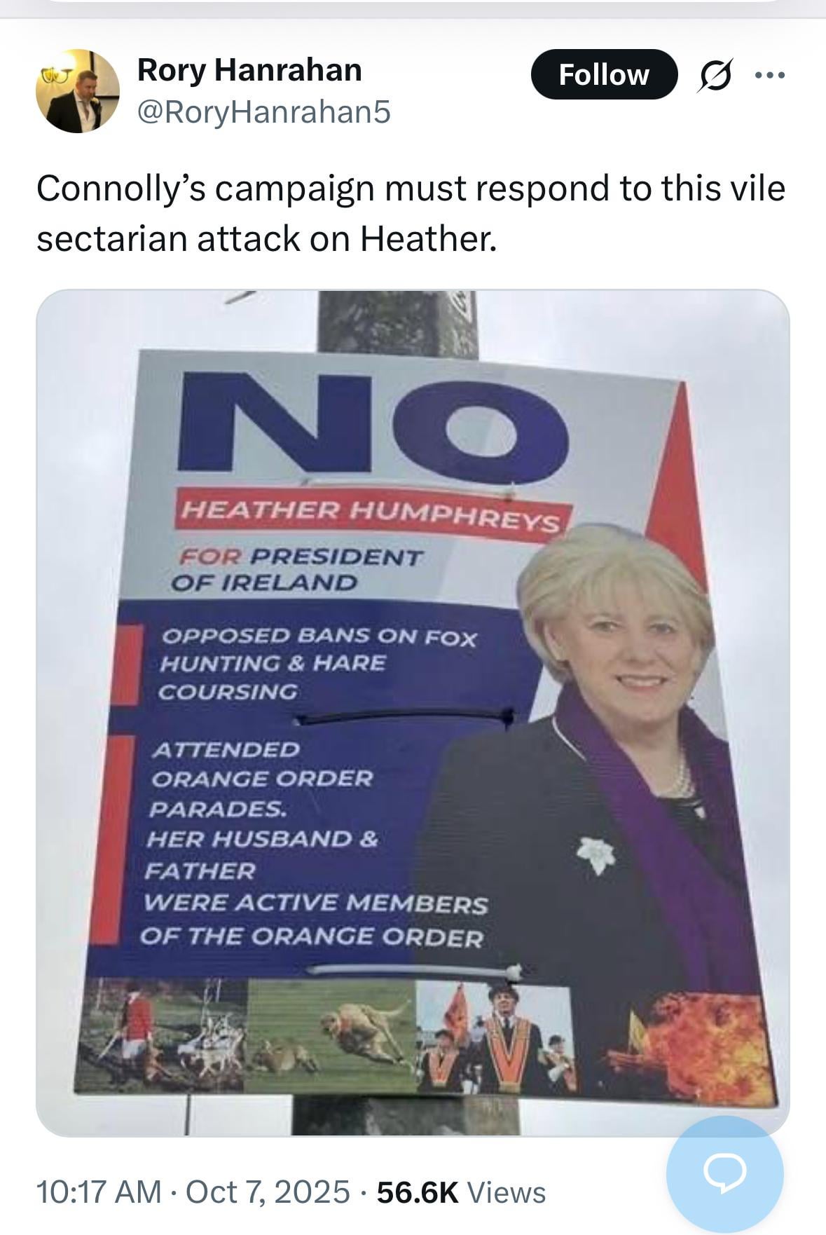 Couldn’t give less of a shite about her orange order connections, it’s of no real relevance. The opposition to fox hunting and hare coursing bans is very concerning though.