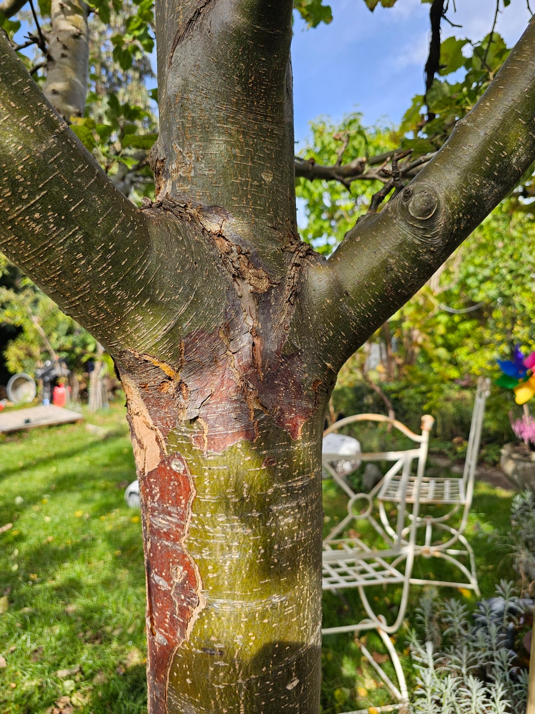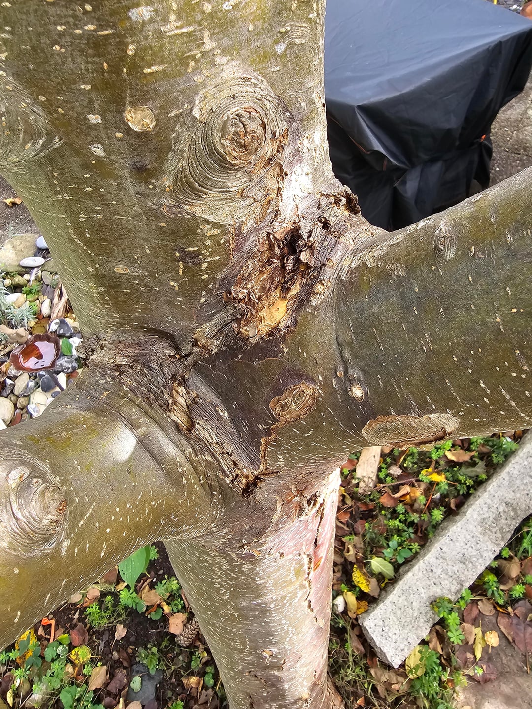 Ich habe eine Alkmene die im Hochstamm wächst. Jetzt haben sich an der Rinde braune Stellen und Risse gebildet.
