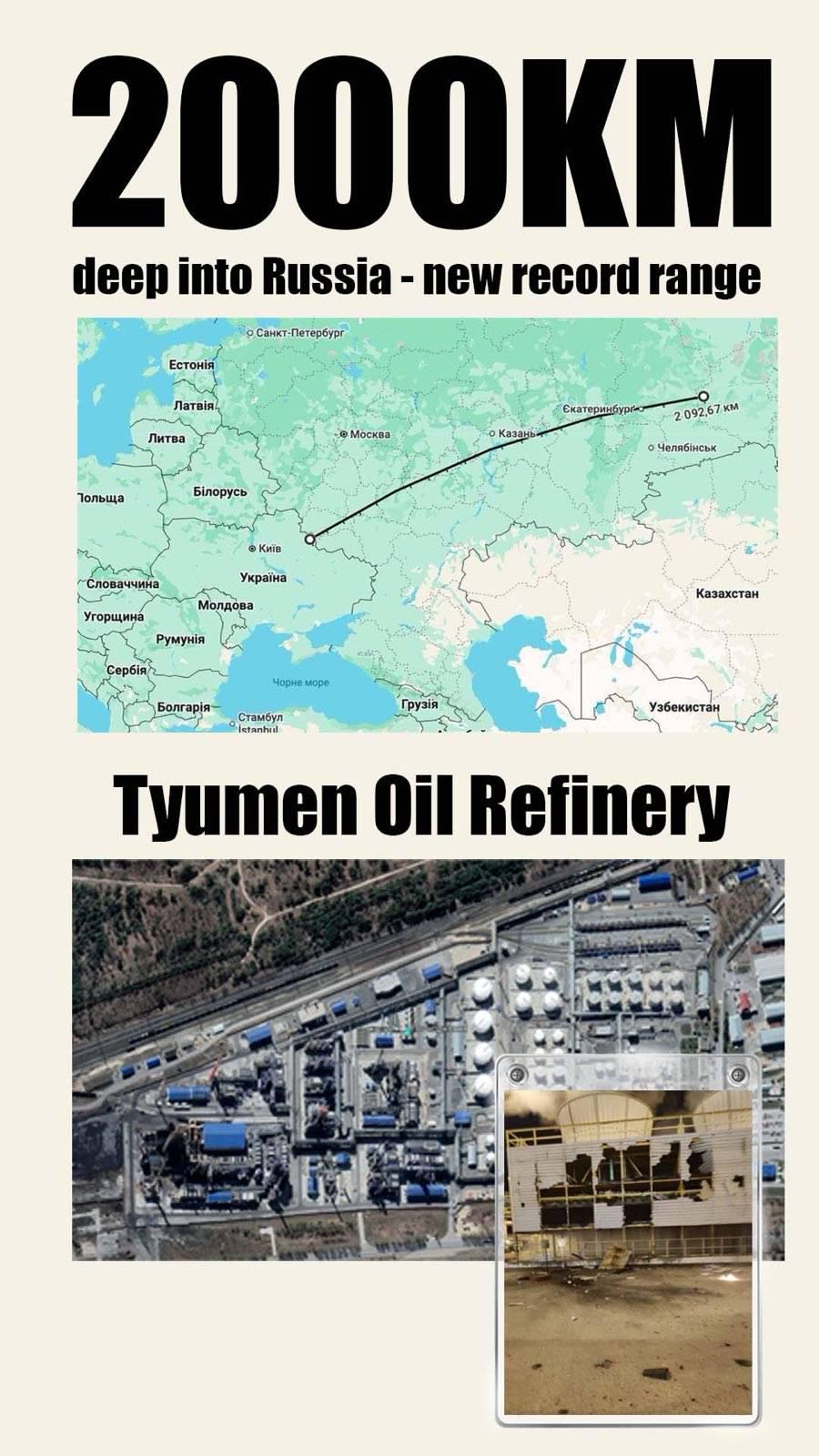 A Ukrainian drone strike damaged a refinery cooling tower in Tyumen, π·πΊ β 2,000 km from Ukraine. This is reportedly the longest-range UAV attack to date. (Dnipro OSINT)