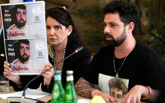Merav Gilboa-Dalal, left, shows a photo of her son Guy, one of the hostages being held by Hamas, as she’s flanked by Guy’s brother Gal, during a press conference in Rome, April 8, 2024. (Alessandra Tarantino/AP)