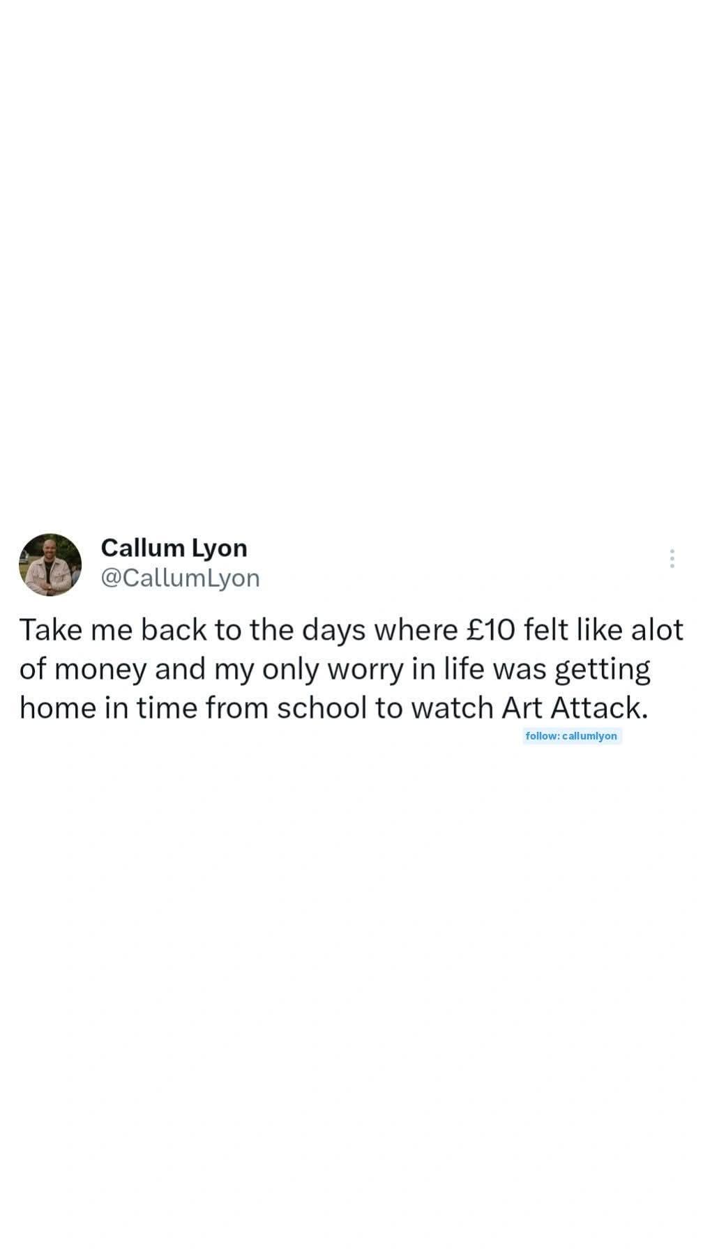 The days 😜 by Particular_Ice_2964 Tags:Great BritishGreat British MemesMemesUnited Kingdom 9 comments Probably Only show back then which I never missed and help me get into creative hobbies and ultimately career bending for me . When £1 could buy you a slice of pizza from the school tuck shop. And now you spend £10 on a portion of chips only to get home in time to *have* an Art Attack. So you want to be a kid again Just become a teacher. Having £10 to spend on yourself will still feel like a luxury and getting home after a long day at school still feels amazing. You had a tenner all at once as a kid, damn…was you rich 😅 Jeeze now I feel old. I’m old enough to remember the before-days, when ‘Take Hart’ was the art show that kids ran home to watch. People confuse things being shit with just wanting to a be a kid with no responsibility I stg You mean the days when you were a child with no financial responsibilities or bills to pay, and nothing of any true importance to worry about? I’m old enough that the person who wrote this would have been one of my kids. £10 was not a lot of money, unless you were homeless or a child. Comments are closed.