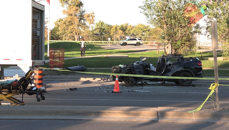 Brampton collision A badly damaged SUV is at the scene of a collision in Brampton on Thursday, Oct. 9, 2025. (Jacob Estrin/CTV News)