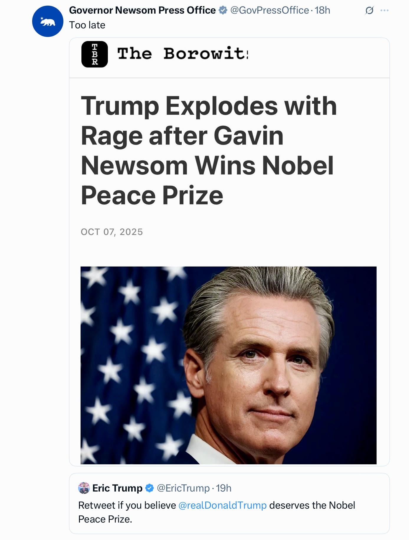 BREAKING: Gavin C. Newsom wins the Nobel Peace Prize. Obama came in second. Trump is demanding a recount from Norway. ππ³π΄