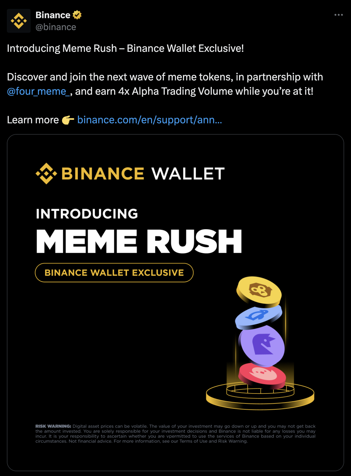Binance Wallet has launched a meme coin-focused initiative called Meme Rush. The program, confirmed by Binance after days of speculation and cryptic social media posts, introduces a wallet-exclusive launch zone where users can buy new meme tokens during their earliest phases.