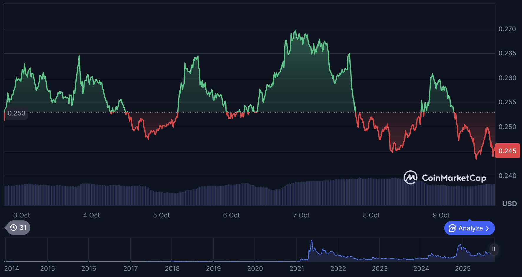 Whale buying keeps the long-term outlook bullish, but DOGE must hold $0.25 to stay in the game. A clean break above $0.26 could open a path to $0.41, a key level from earlier rallies. Drop below $0.24, though, and Dogecoin could fall behind.