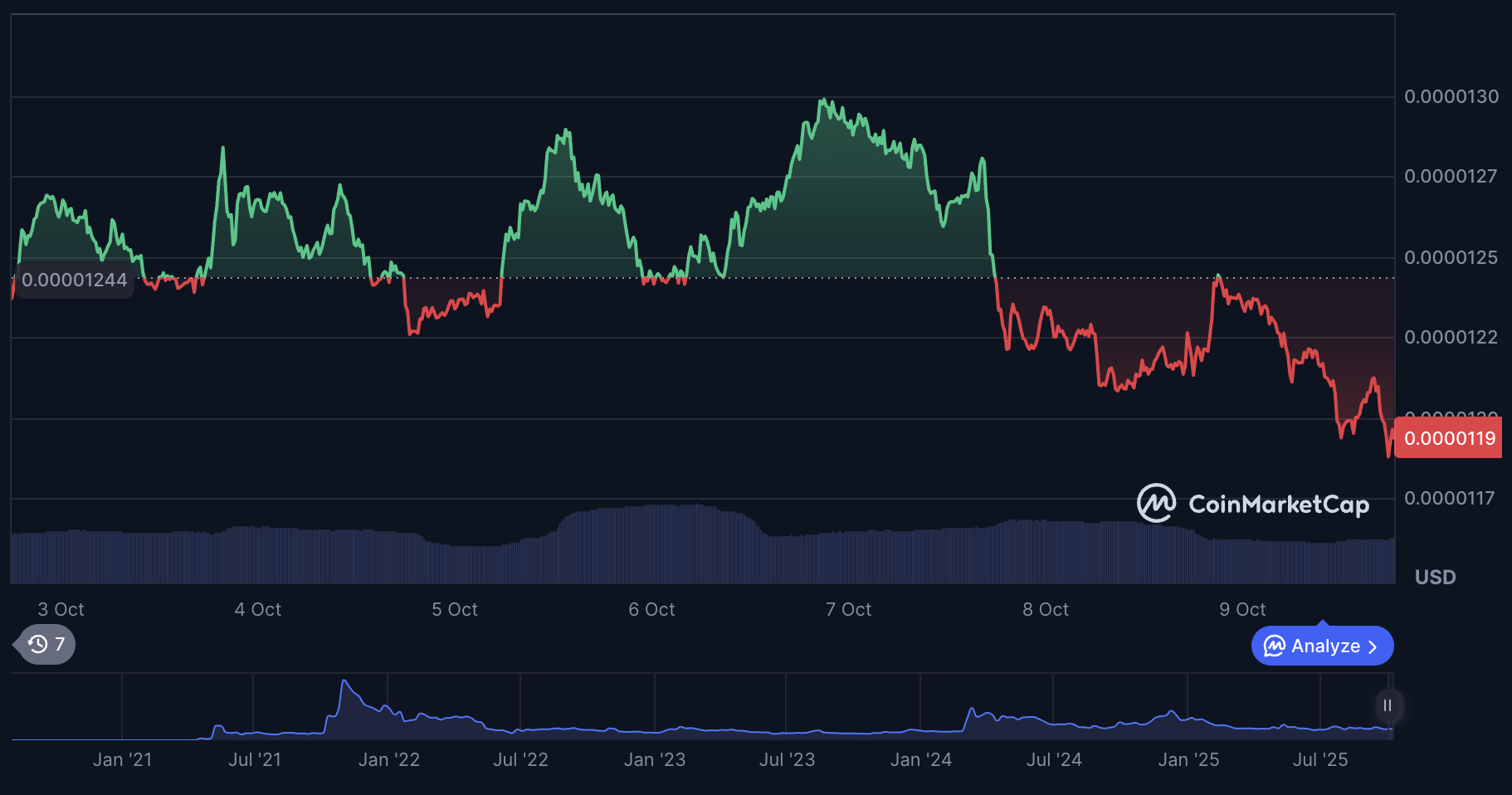 If SHIB drops below $0.00001202, traders will likely eye $0.00001148 as the next support. A break there could spark more selling. On the upside, a bounce above $0.00001250 might push the price toward $0.00001316, the 50% Fib level between the September high and low.