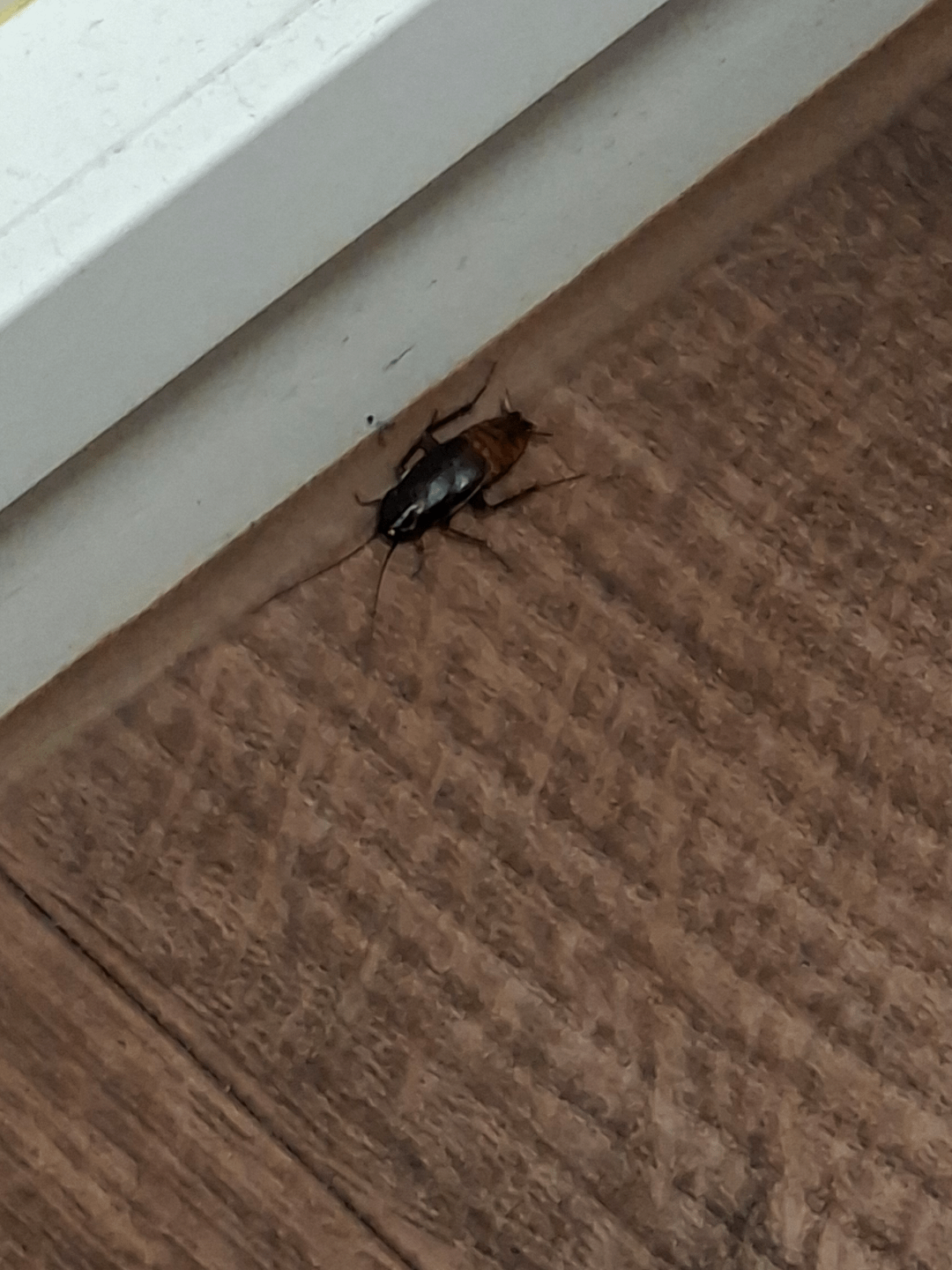 Eine Schabe ist es definitiv, für mich sieht es nach einer Orientalischen Schabe a.k.a. Küchenschabe (*Blatta orientalis*) aus. Frag gerne auch noch in r/germanroaches ~~zur Bestätigung~~ (~~und~~ für Hinweise zur Bekämpfung), der Sub ist auf alle Schädlinge unter den Schaben spezialisiert.