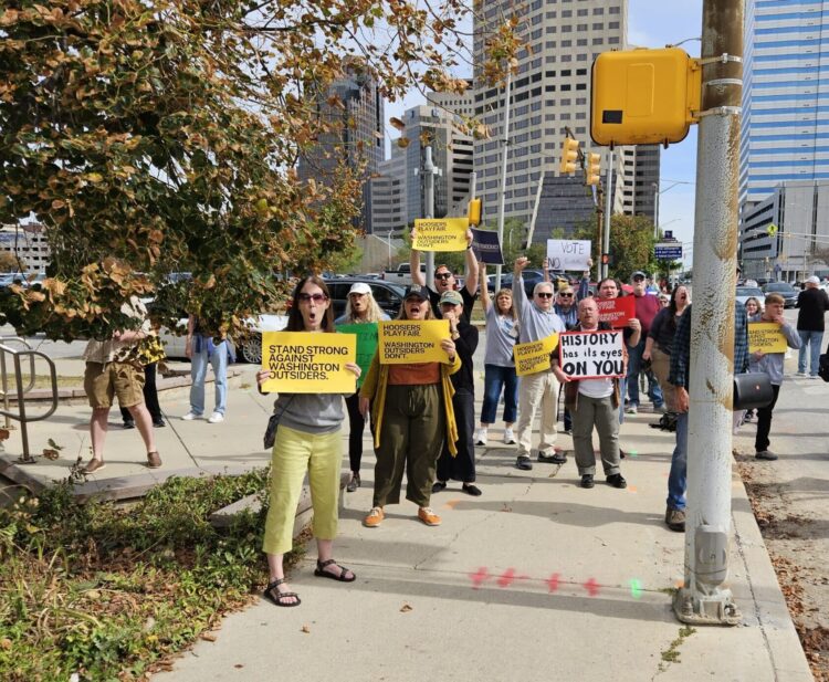The crowd protested outside the Indiana State Library where Vice President JD Vance was meeting with Republican state lawmakers. (Photo/Marilyn Odendahl)