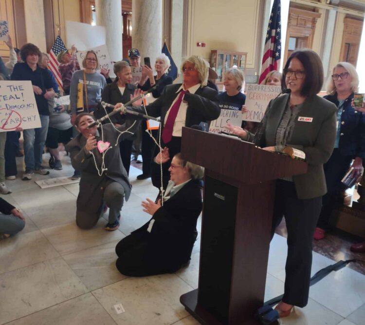 Several voting-rights organizations had representatives at the protest. Julia Vaughn, Common Cause Indiana executive director, and Megan Robertson, Indiana Conservation Voters executive director, spoke to the crowd. Also, Amy Courtney, MADVoters Indiana executive director, gave brief remarks while some of her colleagues, dressed as Trump, Vance and Braun, pantomimed a puppet show.