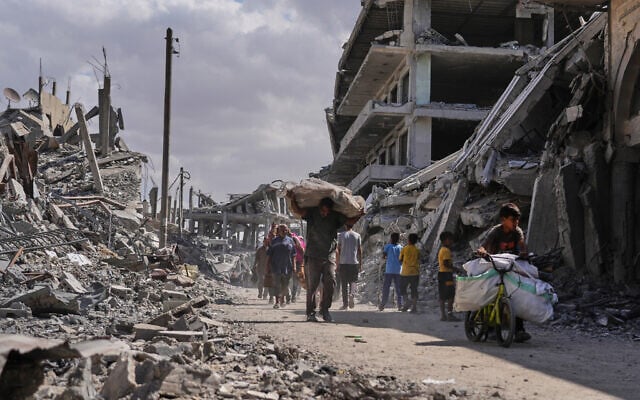 Displaced Palestinians walk with their belongings past destroyed buildings as they return to their homes in Khan Younis, southern Gaza Strip, October 10, 2025, after Israel and Hamas agreed to a ceasefire and the release of the remaining hostages. (AP Photo/Jehad Alshrafi)