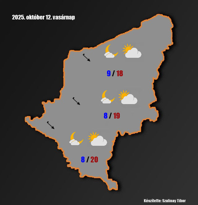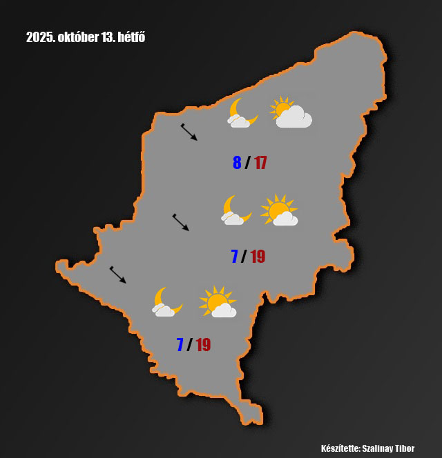 Hétfő: változóan felhős, napos idő várható. Az északnyugati szél megélénkül. A hajnali órákra 7-9 fok közé hűl a levegő. A nappali hőmérsékletek 17-19 fok között alakulnak.