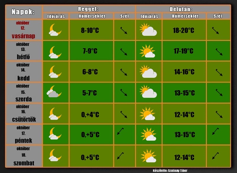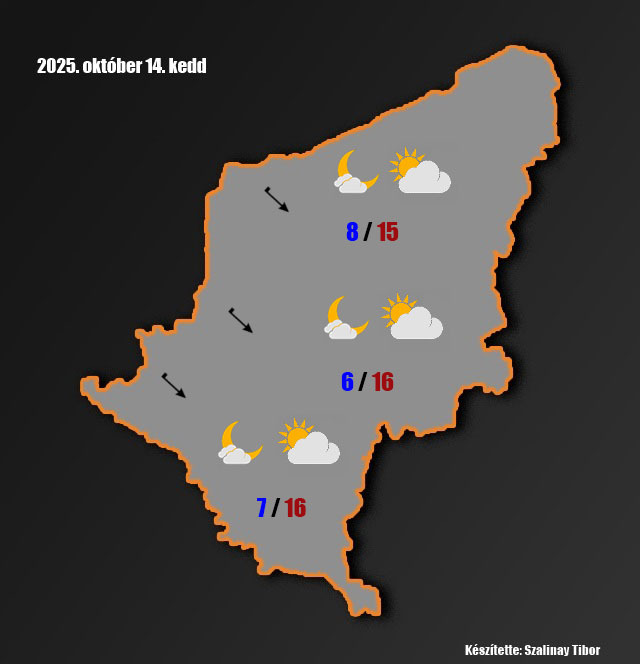 Kedd: a változóan, időnként erősen felhős ég mellett több-kevesebb napsütés is lehet. Az északnyugati szél megerősödik. A hajnali órákra 6-8 fok közé hűl a levegő. A nappali hőmérsékletek 14-16 fok között alakulnak.