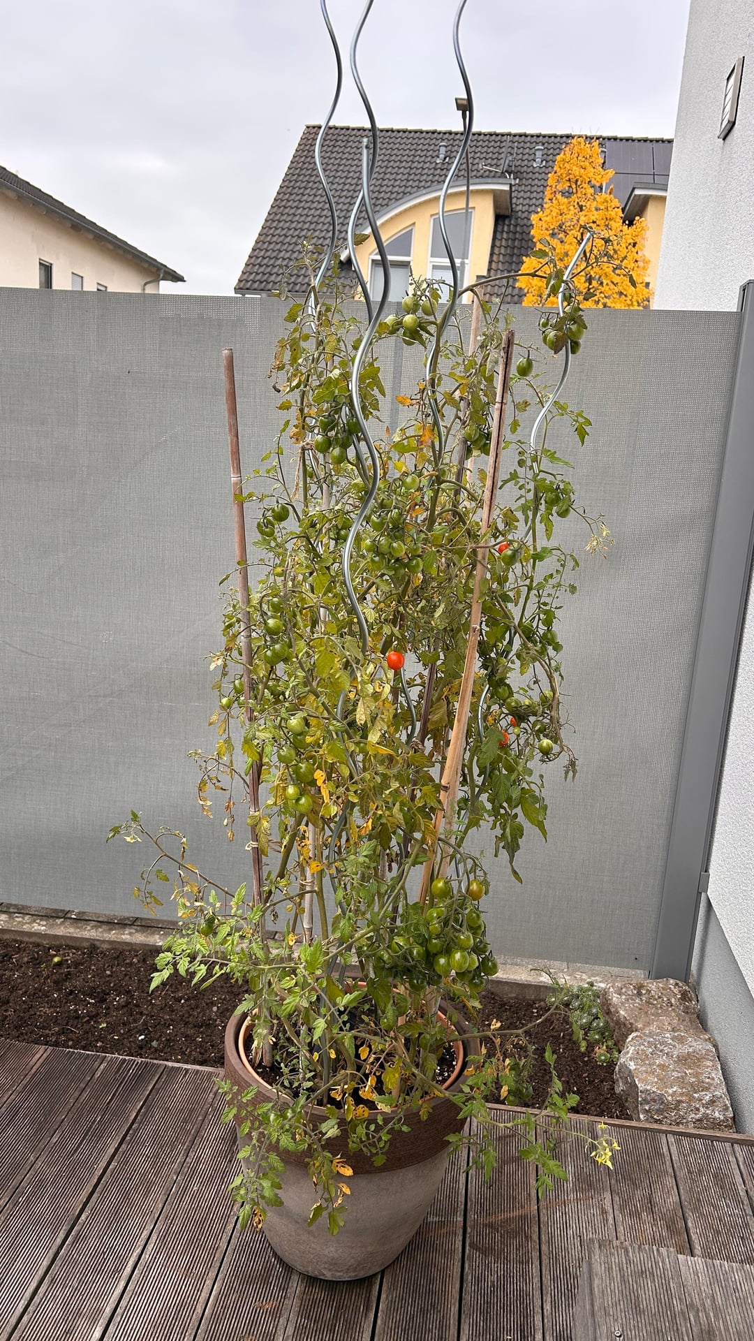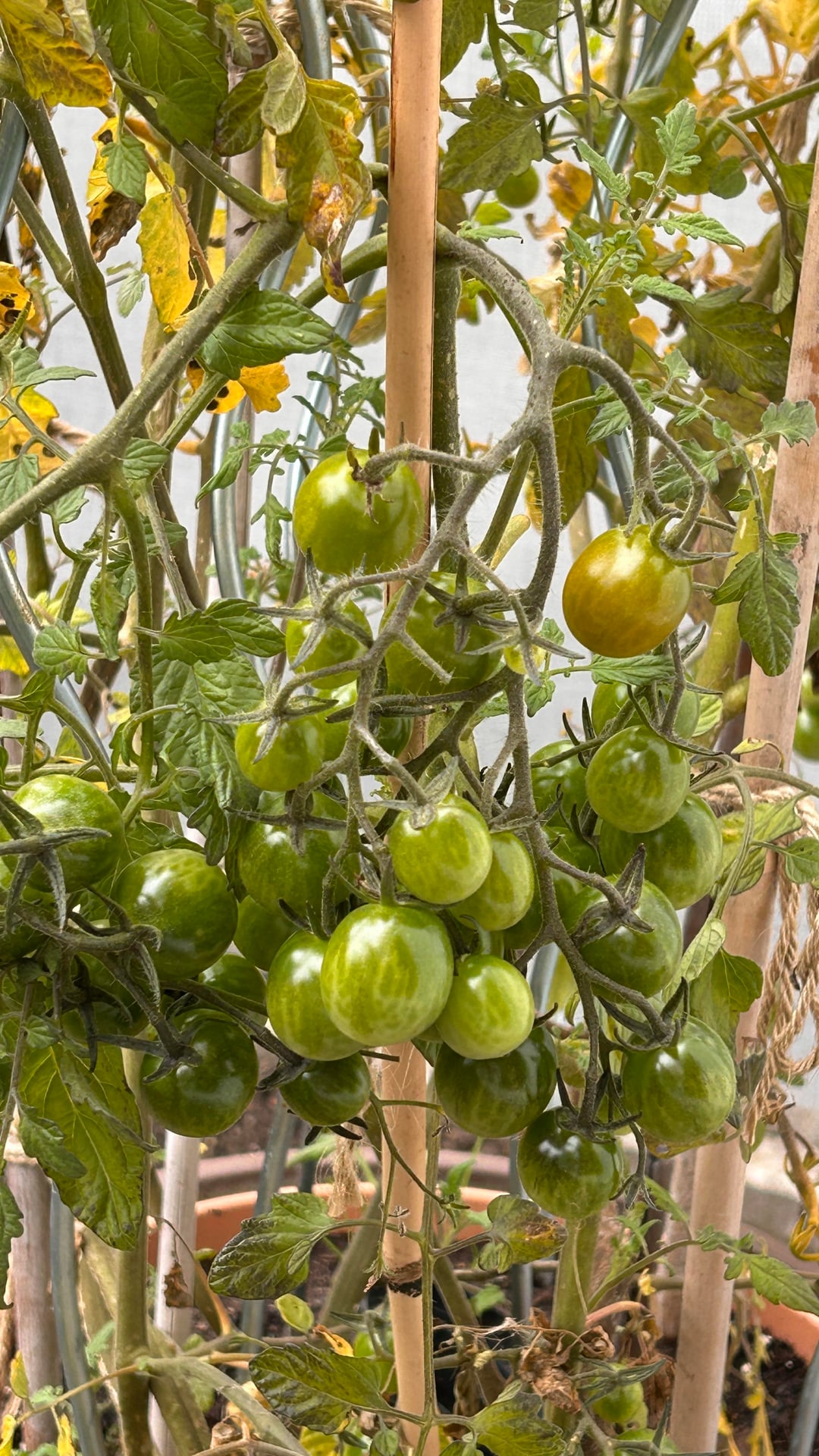 Die grünen Tomaten ab machen und in eine PappBox mit Zeitungspapier und ggfs. einen Apfel dazu legen. Sollte so bei Zimmertemperatur an einem gut belüfteten Ort stehen.