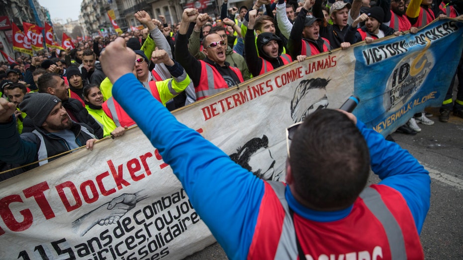 Dock workers raise their fists during a march in Marseille, southern France, Tuesday, Dec. 17, 2019. Workers at the Eiffel Tower, teachers, doctors, lawyers and people from across the French workforce walked off the job Tuesday to resist a higher ret