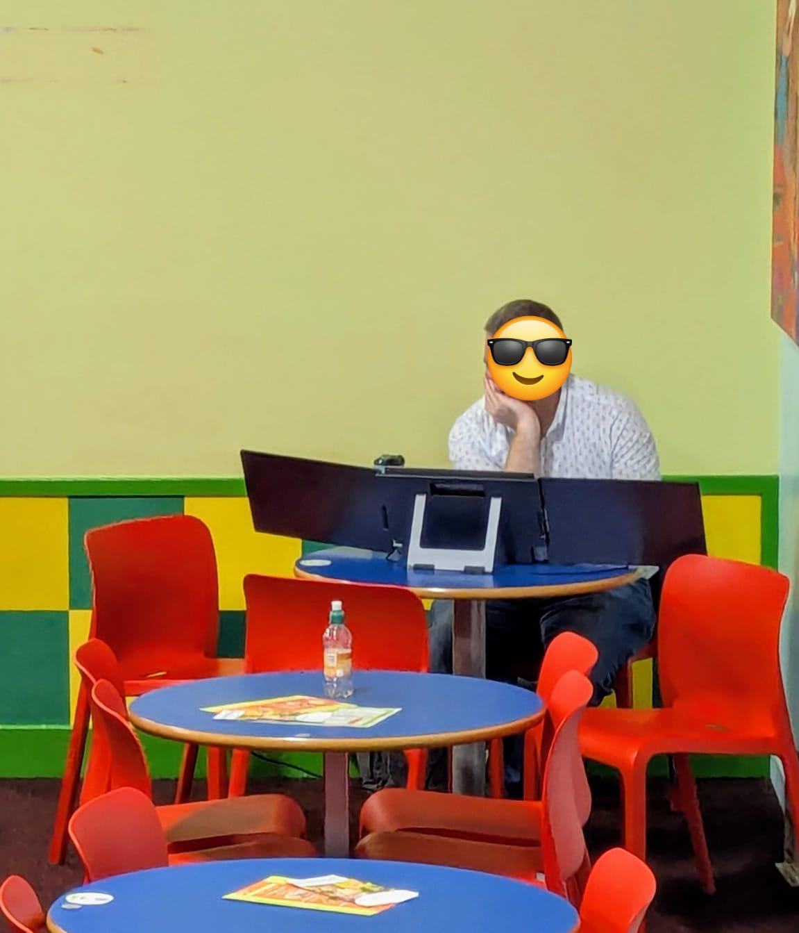 I mean he is ‘wfh’ and letting his kids play around rather than being stuck in the house. I think it’s kinda cute. What if we had more soft play and out of office work spaces for parents with young kids (with less garish decor)?