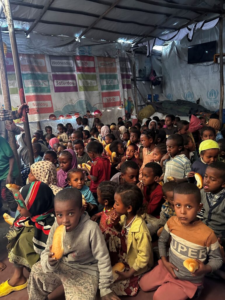 Debre Birhan, ETHIOPIA – Displaced children living here in a packed refugee camp – escaping from dangerous conflict areas with their families – get little food and even less education.