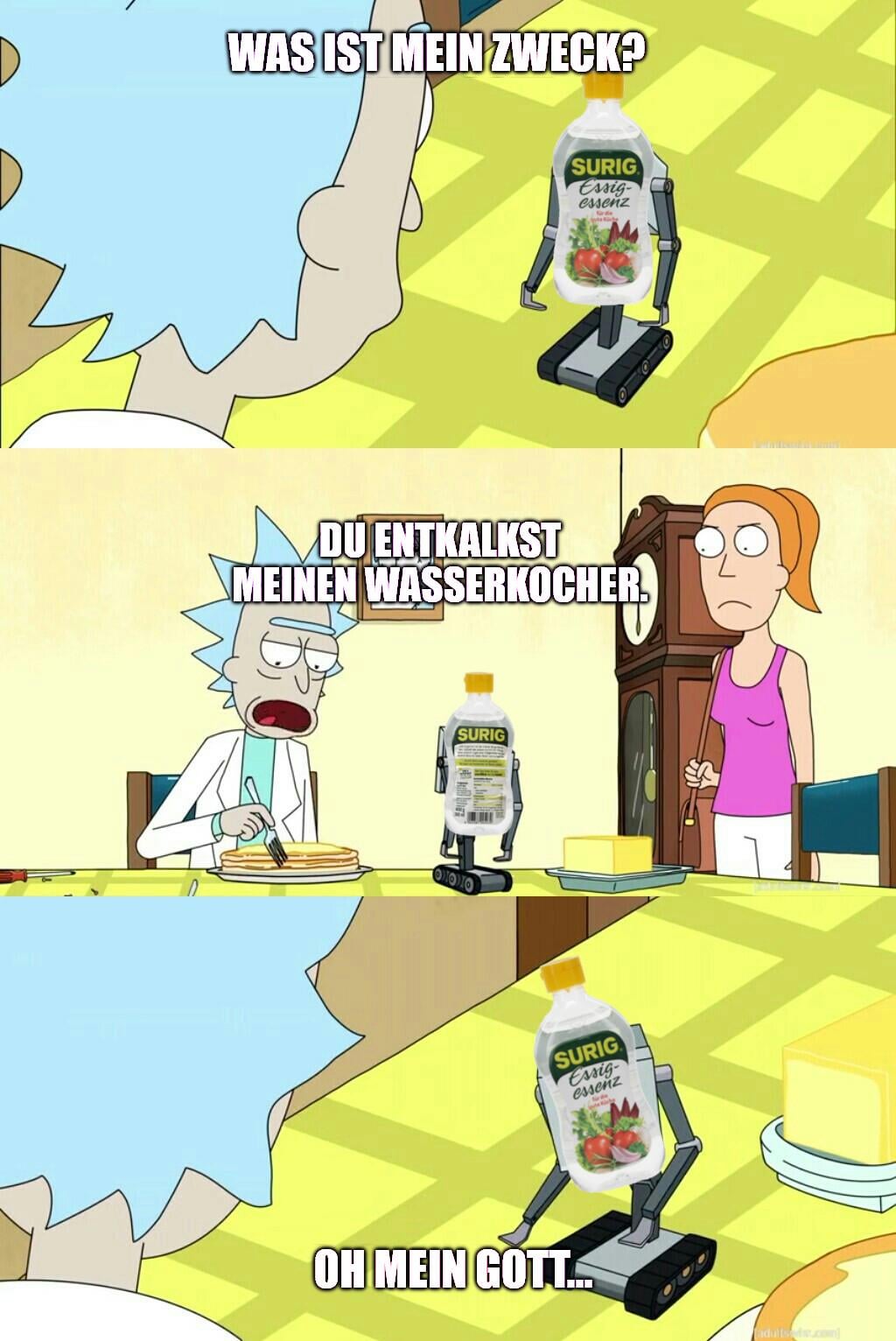 Ich habe eine Weile in den USA gearbeitet und der große Supermarkt in der Nähe hatte so eine “International Aisle”, wo sich im deutschen Regal neben Schwarzbrot und Milka auch ganz oben links ein paar Flaschen Essigessenz versteckten. Irgendwann war’s halt Zeit, was gegen die Teeflecken in der Spüle zu unternehmen, also habe ich eine davon runtergeangelt, den Staub abgewischt und bin zur Kasse. Die Kassiererin hat kurz gestutzt und mich gefragt, wozu man das benutzt. Ich habe halt gesagt, dass ich niemanden kenne, der damit Salat anmacht, aber dass es absolut fantastisch beim Putzen ist. Als ich das nächste Mal da war, war tatsächlich eine zweite Flasche weg. 😁