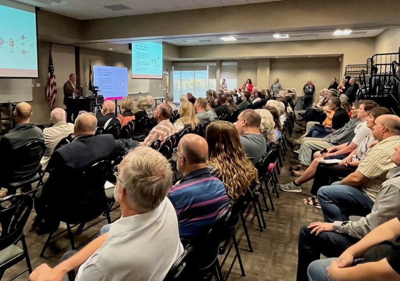 Radiant Director of Operations Matt Wilson speaks to a full house at the Bar Nunn Community Center in March 2025. (Tommy Culkin/Oil City News)