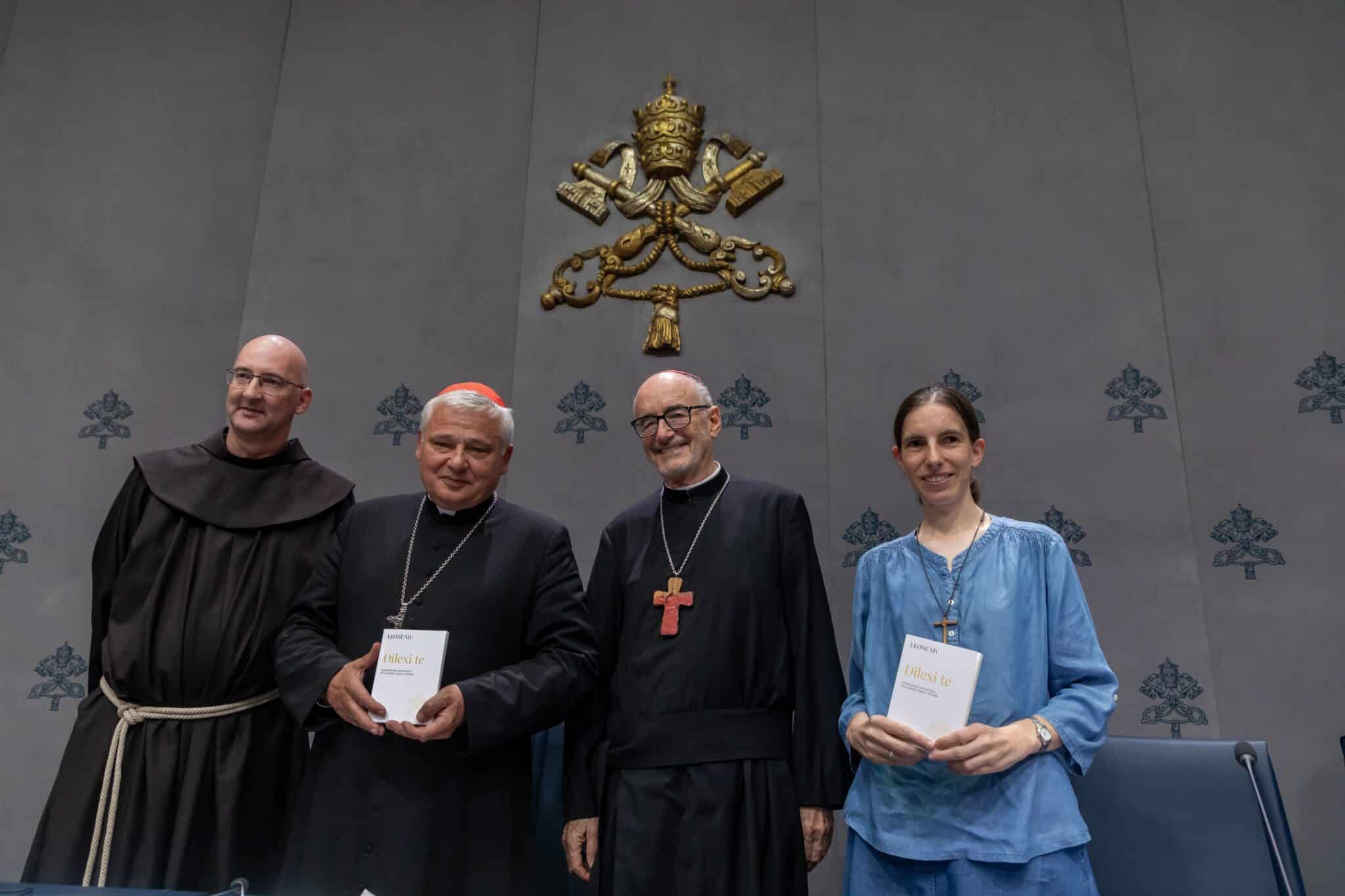 After a Vatican news conference to present Pope Leo XIV’s apostolic exhortation “Dilexi Te” (“I Have Loved You”), Oct. 9, 2025, the speakers pose for a photo. From the left they are: Father Frédéric-Marie Le Méhauté, provincial of the Franciscan friars in France and Belgium; Cardinal Konrad Krajewski, prefect of the Dicastery for the Service of Charity; Cardinal Michael Czerny, prefect of the Dicastery for Promoting Integral Human Development; and Sister Clémence, a member of the Little Sisters of Jesus. (CNS photo/Pablo Esparza)