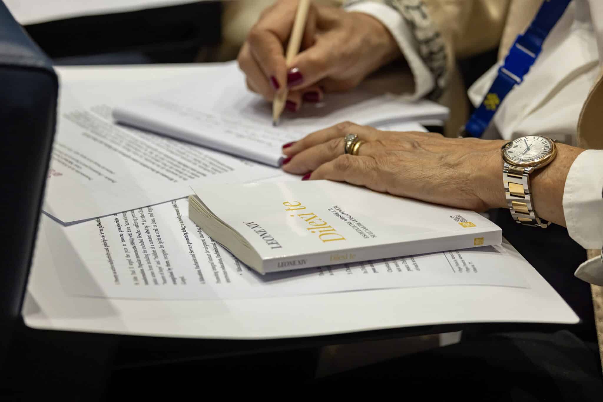 A journalist takes notes during a Vatican news conference to present “Dilexi Te” (“I Have Loved You”), Pope Leo XIV’s apostolic exhortation, Oct. 9, 2025. (CNS photo/Pablo Esparza)