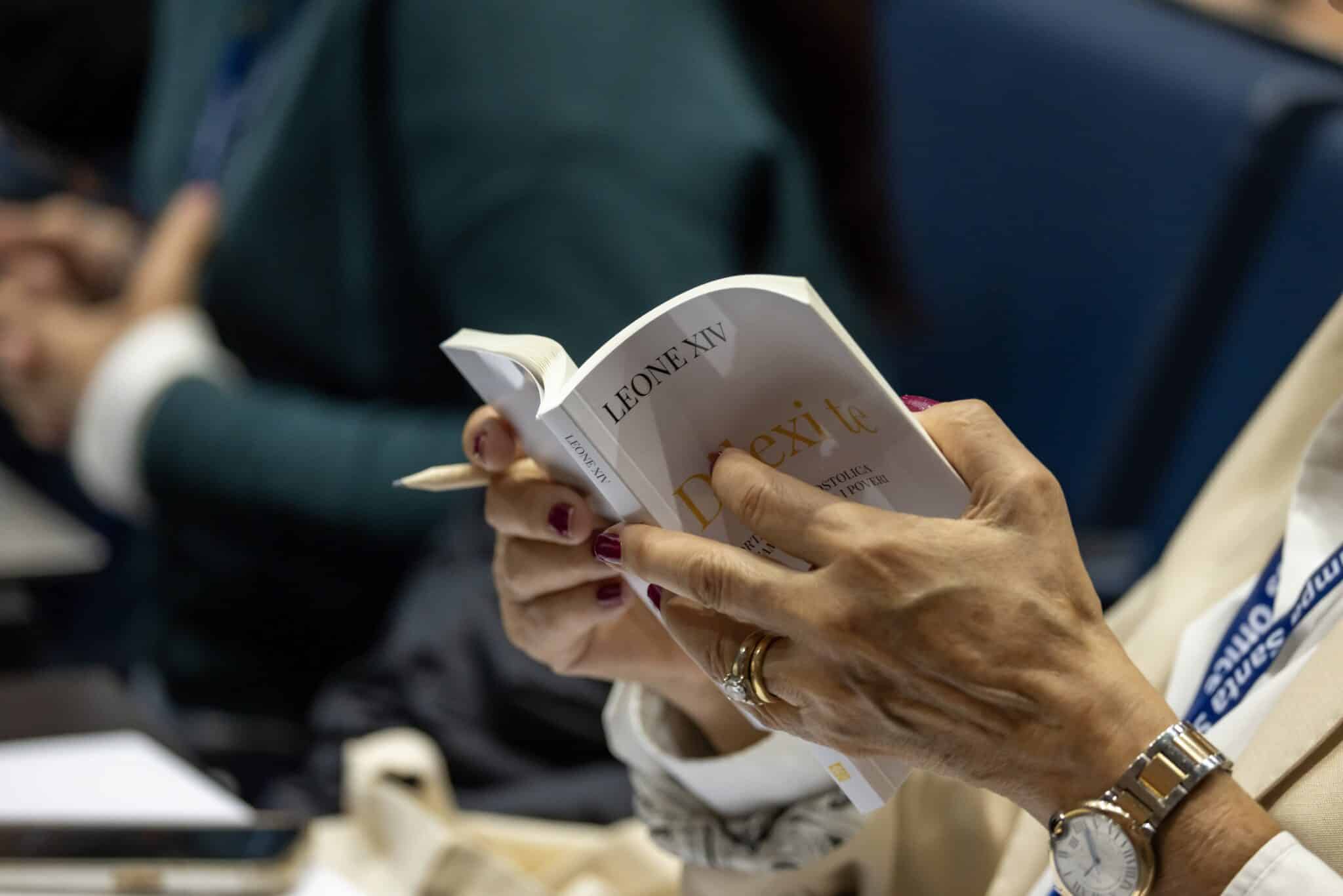 A journalist looks through the Italian translation of “Dilexi Te” (“I Have Loved You”), Pope Leo XIV’s apostolic exhortation, during a news conference at the Vatican to present the document Oct. 9, 2025. (CNS photo/Pablo Esparza)
