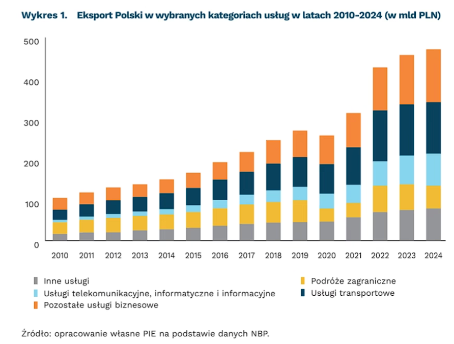 Względną stabilność utrzymują inne kluczowe sektory, chociaż dynamika eksportu w 2024 roku była znacznie niższa niż w latach wcześniejszych. Coraz większe znaczenie zyskują usługi telekomunikacyjne, informatyczne i informacyjne, które stanowiły 17% całego eksportu usług. Ich wartość wzrosła o 11% r/r. Tym samym Polska stopniowo przesuwa się z pozycji „europejskiej fabryki” w stronę roli eksportera usług cyfrowych, chociaż nadal w dużej mierze opartych na pracy dla zagranicznych koncernów technologicznych. Wciąż brakuje nam własnej produkcji i sektorów o wyższej wartości dodanej. Jest to niezbędne jeżeli chcemy przeprowadzić właściwą transformację naszego modelu wzrostu. Więcej: Konsensus Warszawski – nowy model wzrostu dla Polski i Europy.
