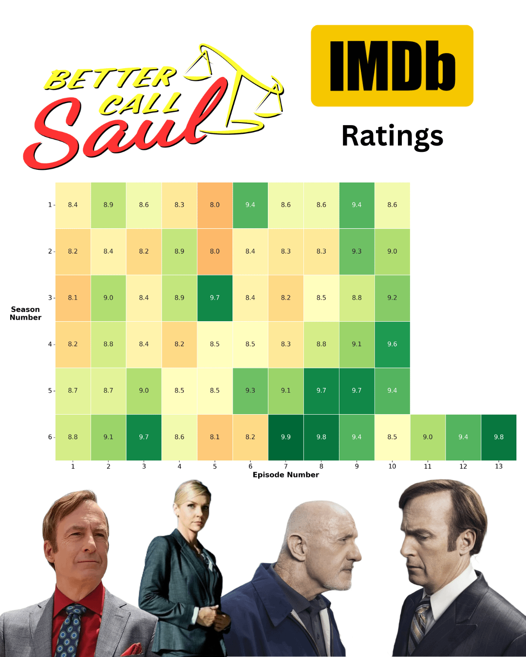 My issue with the color scheme as applied to this data is it makes you think there are bad episodes of the show. The lowest rated episode is 8.0/10, which is *really* good.