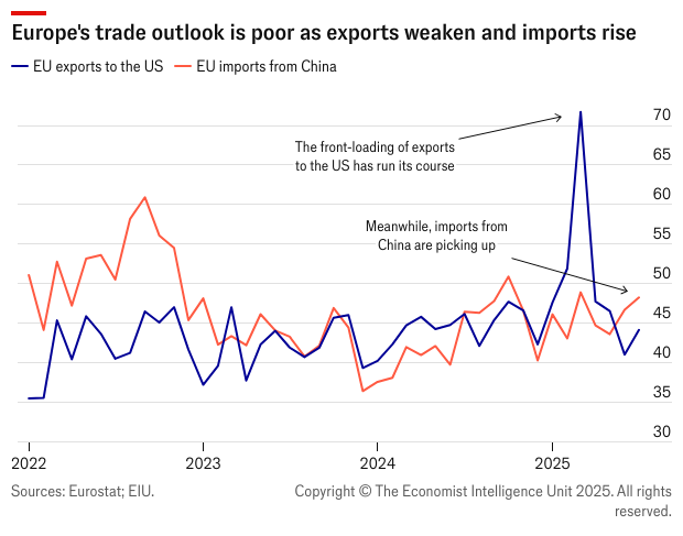 Europe faces a lacklustre growth outlook as rapid changes in US trade policy and the US-China trade war have raised uncertainty, damaging business and consumer sentiment, and weighing on investment. Blanket 15% US import tariffs on goods (including cars, chips and pharmaceuticals), and 50% tariffs on metals, will damage European export growth, with Germany the worst affected. Export growth was boosted by a front-loading trend in early 2025, to beat the imposition of tariffs, but this has now come to an end. That said, consumer spending will be supported in 2026 by lower inflation and interest rates, with a number of factors–US tariffs, the strong euro and a rise in Chinese imports–contributing to disinflation.