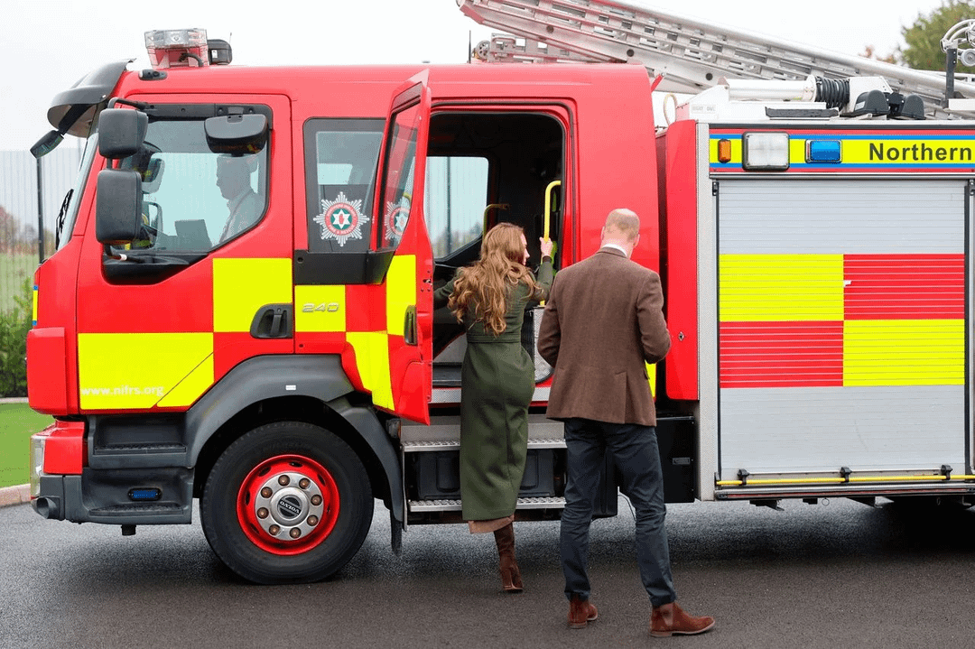 “The Prince and Princess of Wales rode in a fire truck and watched trainee firefighters taking part in drills during a surprise visit to Northern Ireland”