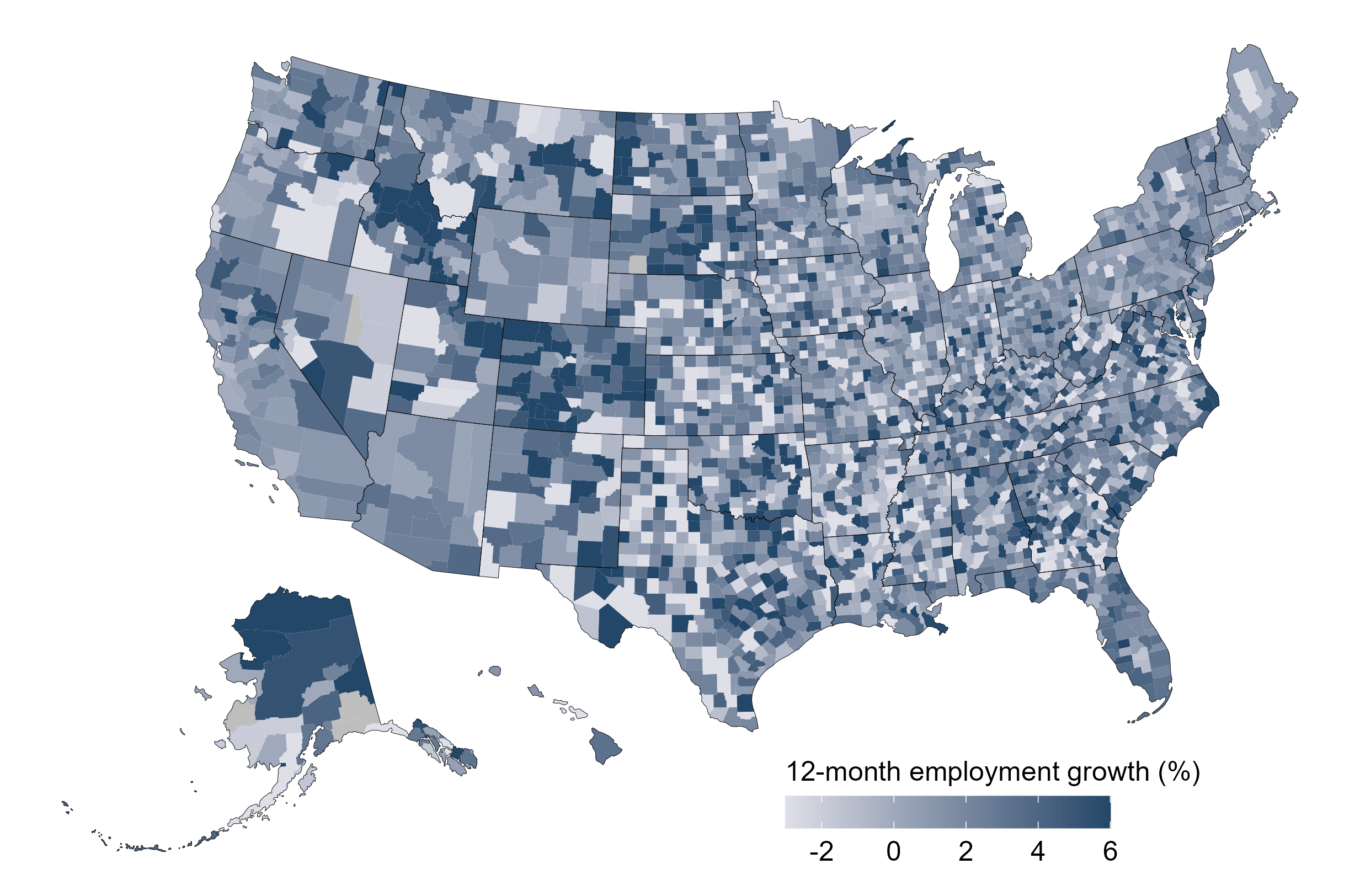 Figure 1 demonstrates this pattern using the 12-month percent change in employment for each county. Though there is substantial variation, there are clusters of counties with higher growth rates and clusters of counties with lower growth rates. This is a demonstration of positive spatial correlation: Like clusters with like.