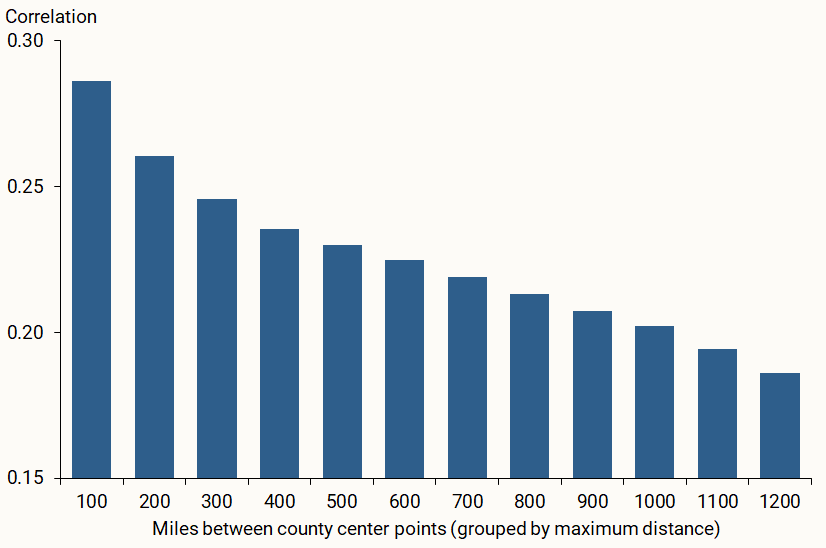 Note: Calculations exclude county pairs in which one county is in Alaska or Hawaii. Distances are shown for counties up to 1,200 miles apart (75th percentile of distance).