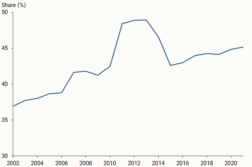 We first examine the amount of cross-county commuting. The U.S. Census Bureau’s Longitudinal Employer-Household Dynamics Origin-Destination Employment Statistics (LODES) program provides counts of jobs by workers’ county of employment and residence. The data come from administrative records and are available annually from 2002 through 2021. We use these data to estimate the share of jobs filled by workers who do not live in the same county in which their job is based. Although it does not perfectly capture the commuting share, the out-of-county job share offers a suitable proxy for commuting, and we refer to it as such for simplicity. One limitation is that LODES data may overstate cross-county commuting. For example, the job of an Alameda County resident working at an Alameda County branch may sometimes be recorded as a job at the company’s headquarters, say in New York County. This would create a nonexistent cross-county commuting flow in the data. To account for this, we omit jobs that make up a very small share of a county’s out-of-county jobs.
