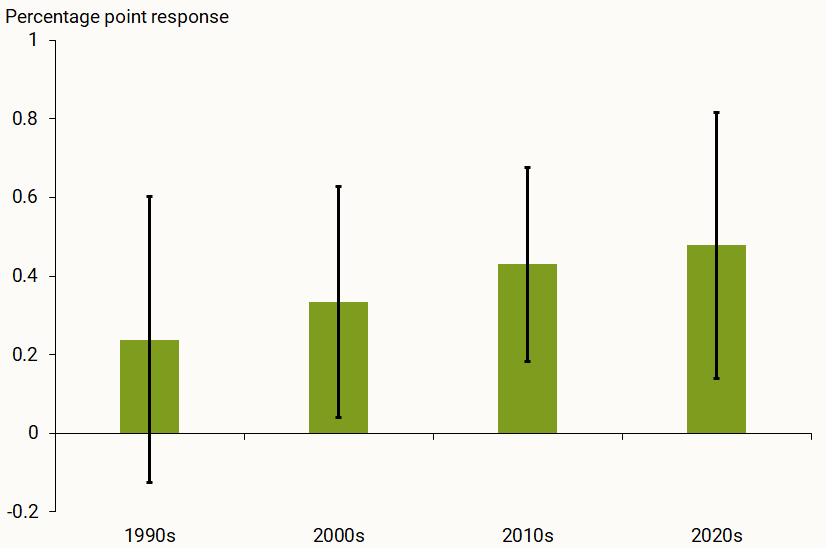 Figure 4 shows the average relationship between county employment growth and our neighbor employment growth measure by decade, along with 95% confidence bands. The results confirm the spatial correlation observed in Figures 1 and 2. For example, if average neighbor employment growth is 1 percentage point higher, county employment growth will typically be 0.5 percentage point higher according to the current estimated relationship (rightmost bar). Comparing across decades, the relationship between counties and their neighbors appears to have strengthened over time. The estimates rise from about 0.2 in the 1990s to about 0.5 in the first half of the 2020s. The increase coincides with the rise in commuting shares from Figure 3, although the difference between the estimates is not statistically significant.