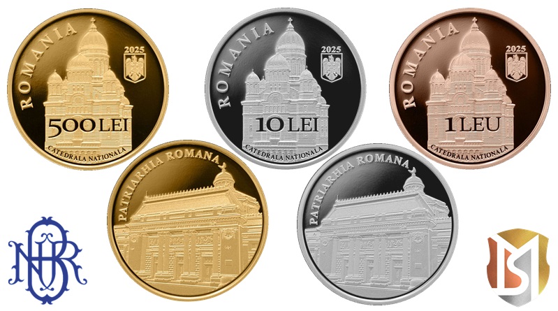 The gold, silver and base metal proof coins are produced by the Monetăria Statului, Romanian State Mint at their facilities in Bucharest on behalf of the National Bank. The design on the obverse side of the coin shared on all three metals features an image of the Patriarchate Palace, the seat of the Romanian Patriarchate, an historic building in Bucharest constructed in 1907 that became the seat of the Romanian Orthodox Church in 1997. Along the upper left rim is the inscription PATRIARHIA ROMANA. The reverse side depicts The People’s Salvation National Cathedral, the tallest and largest Eastern Orthodox Church building by volume and area in the world. Along the upper left rim is the inscription ROMANIA in bold lettering. To the right of the Cathedral is a small shield of the coat of arms of Romania with the year of issue, 2025 placed above. Superimposed over the lower portion of the Cathedral is the denomination 500 LEI (gold) 10 LEI (silver) or 1 LEU (base metal) along with the commemorative text CATEDRALA NATIONALA placed along the lower rim below the image.