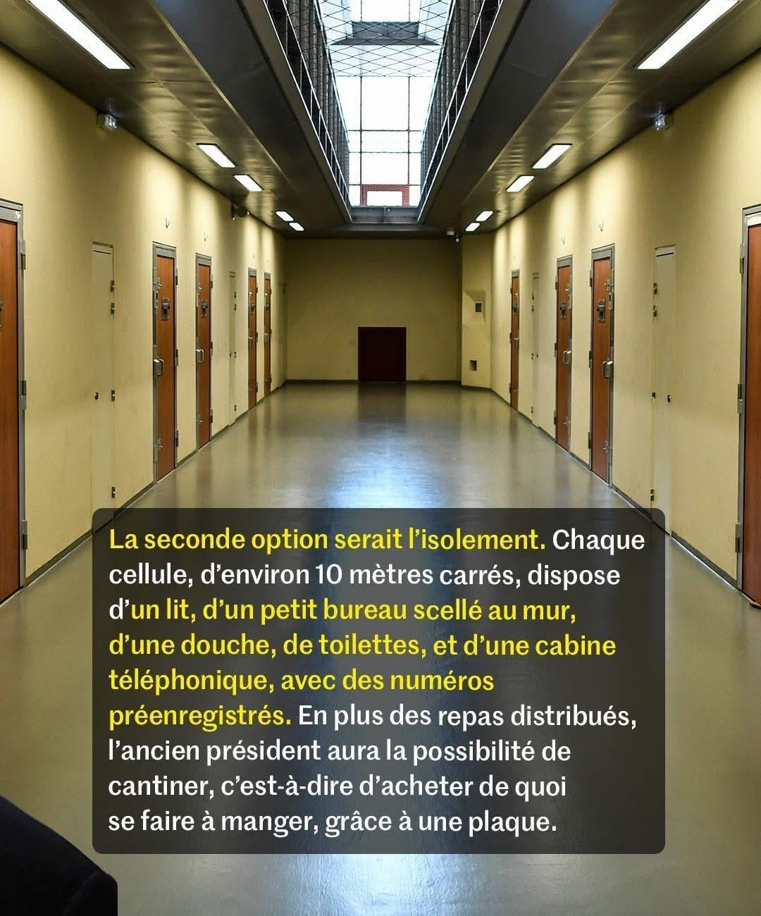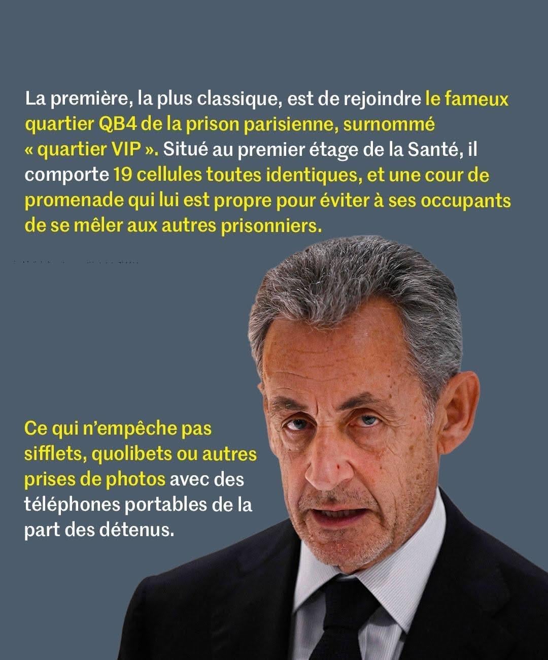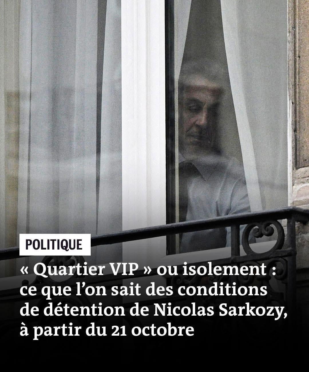 L’article : [« Quartier VIP » ou isolement : ce que l’on sait des conditions de détention de Nicolas Sarkozy, à partir du 21 octobre](https://www.lemonde.fr/politique/article/2025/10/13/quartier-vip-ou-isolement-ce-que-l-on-sait-des-conditions-de-detention-de-nicolas-sarkozy-a-partir-du-21-octobre_6646313_823448.html?fbclid=IwdGRjcANbOlVleHRuA2FlbQIxMQABHpDrGuCd74Gm-GwPWv6nZOaTZp2p8XgfA4nGIXnM5ylrjCx8OnEnNz2r9Mqi_aem_MxBAs4Z5Br8fGSFmqMszfg)