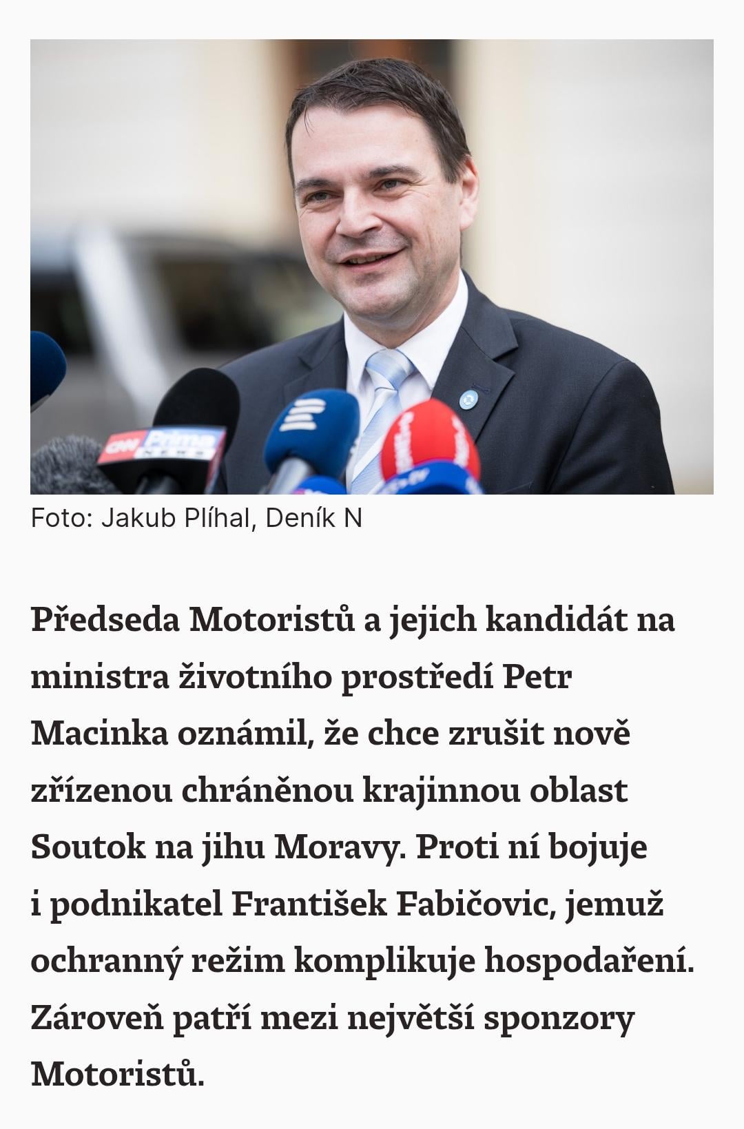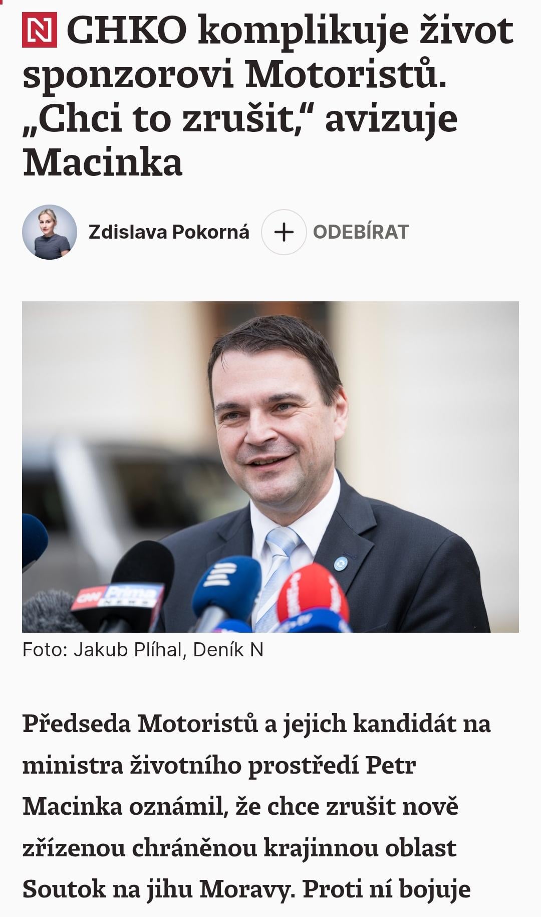 U nás na ve městě, které do CHKO Soutok spadá z velké části, tak vyloženě visel plakát, že to zruší, proto je lidi tady volili. Protože někdo tam má třeba pozemky a nemůžou si tam najednou dělat úplně co chtějí a někdo to reálně kontroluje. Samozřejmě Facebook plný komentářů typu, zlá pětikolka, fialový mafián, buzerace vládou, chtějí to CHKO dělat jen pro prachy… Takže asi tak, já je nevolil a nemám jen rád, jen chci dát insight, Macinka je rodák z Břeclavi, ten to tam má blízko a vyloženě cílil na lidi s tímto přesvědčením, to že už si na tom vydělají i tito lidi, už si voliči nespojí.