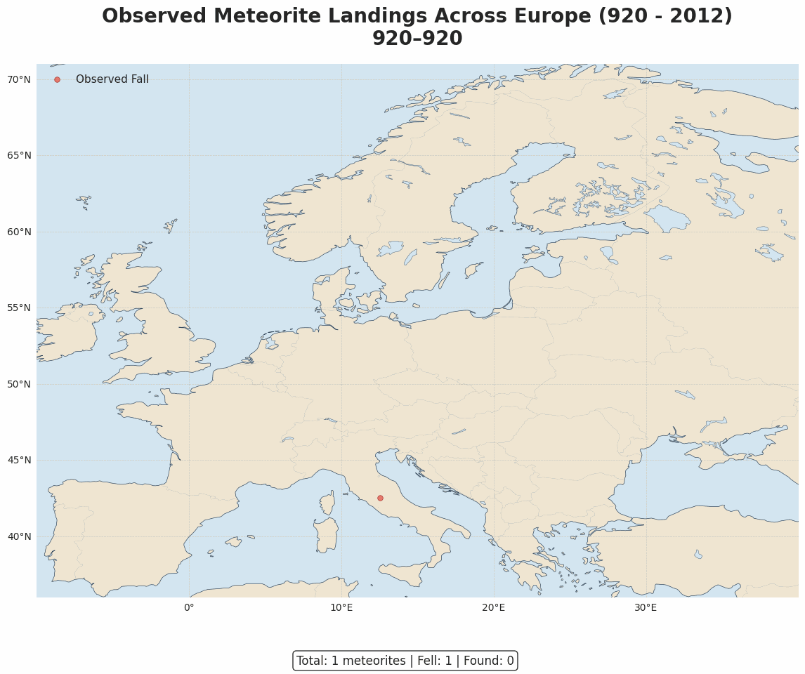 An animated GIF showing the recorded meteorite landings, distinguished by observation or encounter (that is, someone saw the meteorite land or found it later).