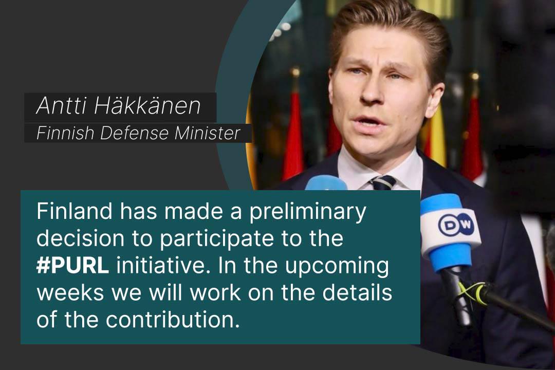 Finland joins the PURL initiative, a NATO-U.S. mechanism to fund priority weapons for Ukraine. Defense Minister Antti Häkkänen announced this decision, with details to follow soon. A new signal of Europe’s unity to stand with Ukraine and provide critical military aid to repel Russia’s aggression