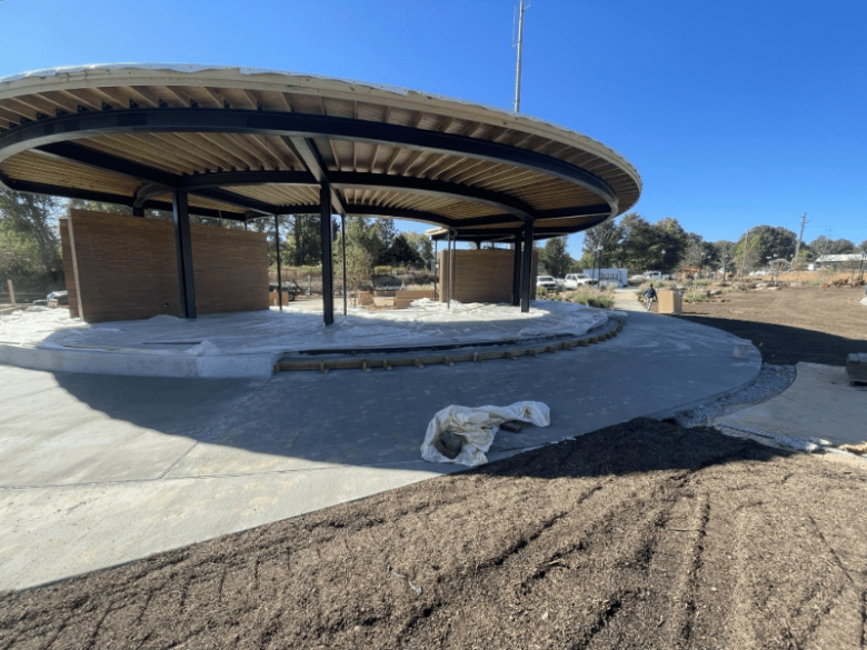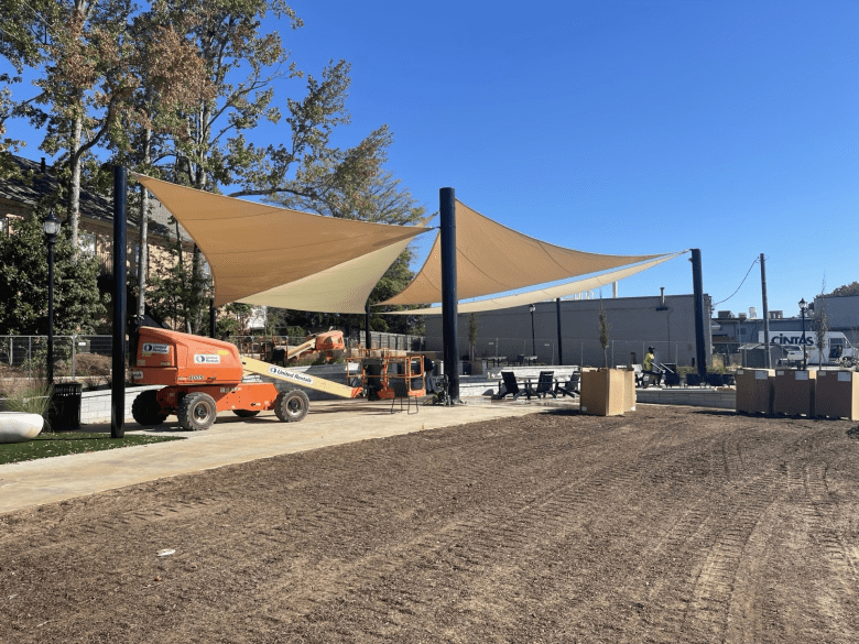 The Tucker Town Green pavilion and steps are still under construction. This is the latest look at the shade seals near the northeast plaza. (Photo by Lowe Engineers)