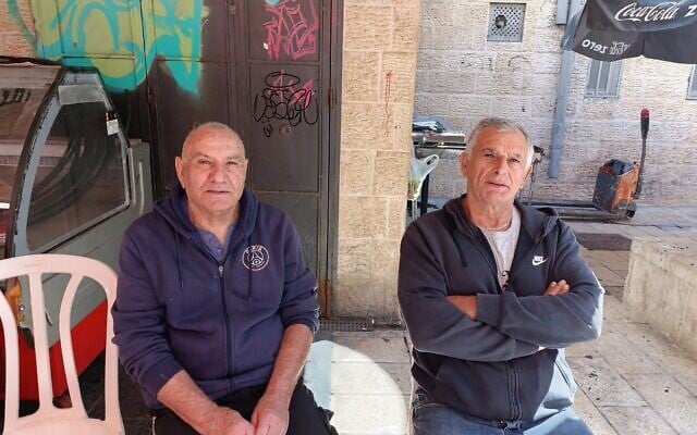 Jerusalemites Ezra and Efraim in the Iraqi market next to Jerusalem’s Mahane Yehuda market, October 15, 2025 (Zev Stub/Times of Israel)