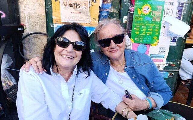 Residents of Israel’s north Ariella and Sorela at Jerusalem’s Mahane Yehuda market, October 15, 2025 (Zev Stub/Times of Israel)