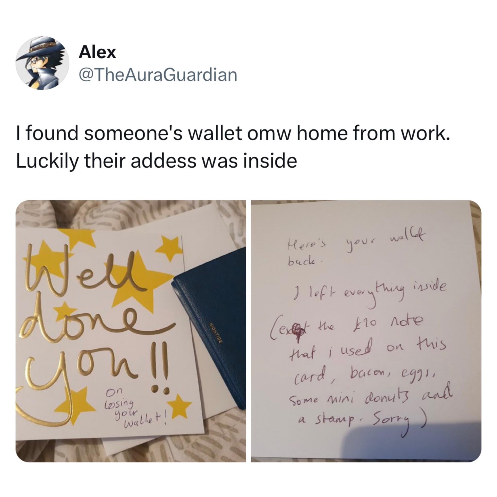 I found someone’s wallet on the bus, gave it to the driver and then messages the guy on Facebook so he could go get it.